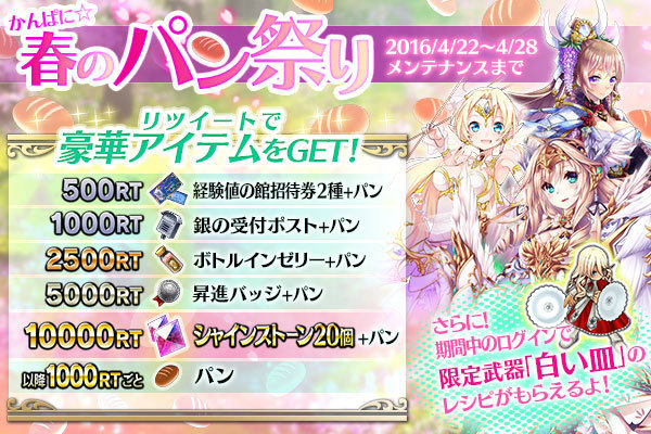 4月22日(金)から4月28日(木)メンテナンスまで、『かんぱに☆ガールズ』公式ツイッターアカウントのリツイートでゲーム内アイテムがもらえるリツイートキャンペーン「かんぱに☆春のパン祭り」を行います。