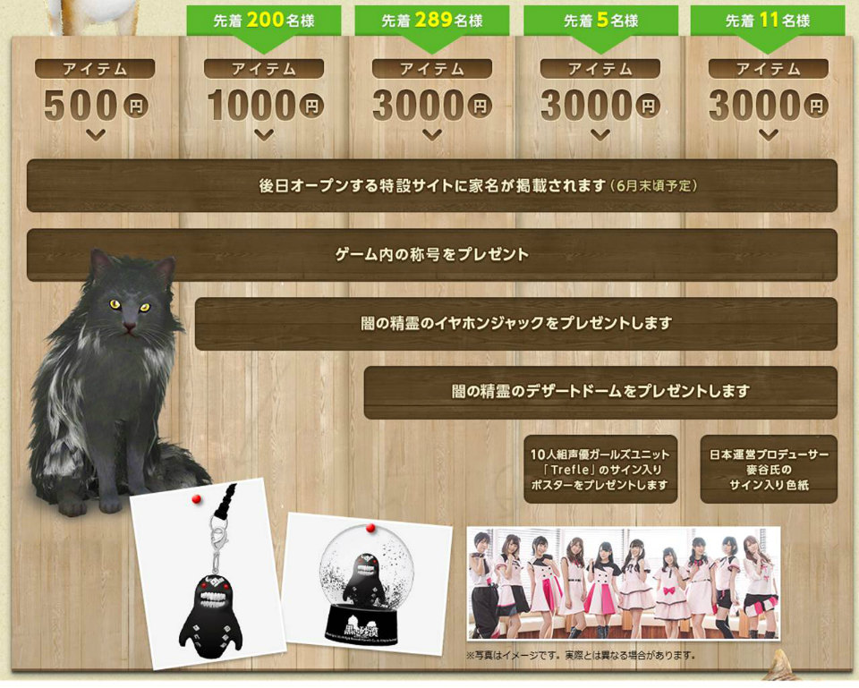 本企画では、寄付金の一部をアレックスが運営するクラウドファンディングサービス「COUNTDOWN」を使用してご支援いただきたいと考えております。ご協力いただきました方には、声優の後藤友香里さんが所属するガールズユニット「Trefle」のサイン入りポスターや闇の精霊のイヤフォンジャック、ゲーム内称号などをプレゼントいたします。