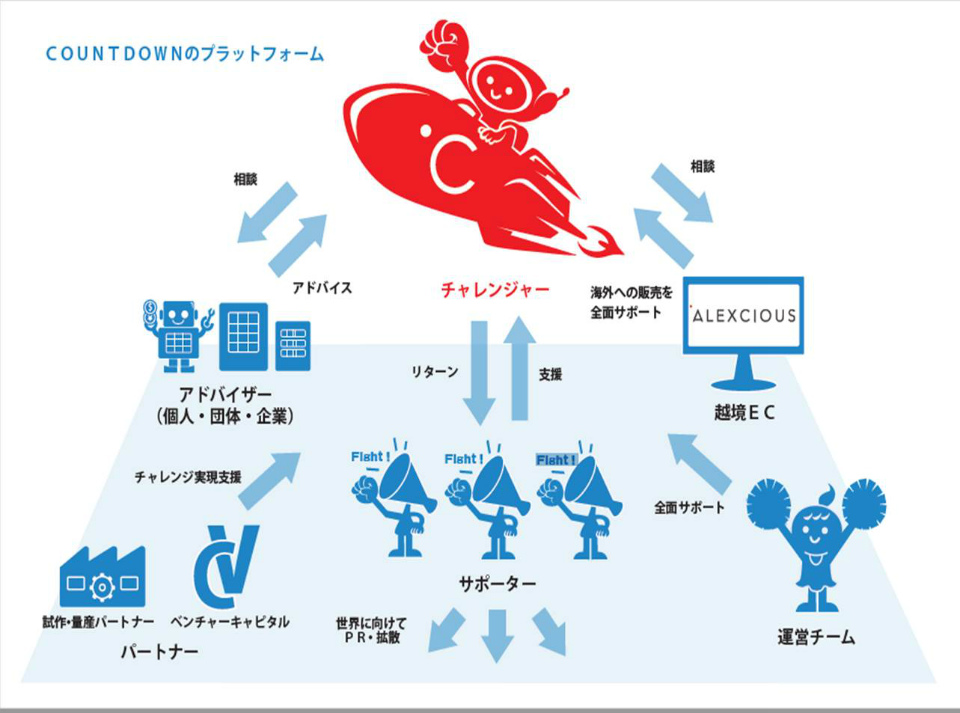 アレックスが運営する、日本から世界に挑戦するクラウドファンディングサービスです。「COUNTDOWN」には「可能性にかけてチャレンジする人」と「その実現をサポートする人」が集まり、革新的なプロダクトやテクノロジー、未知の映像、音楽などのデジタルコンテンツ、これまでにないサービスや取り組みなど、ユニークで新しいアイデアを持ったチャレンジャーが集い、さまざまな形で支援を提供するサポーターとともにその実現を目指します。