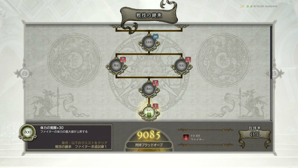 「戦技の継承」は白竜に話しかけることで利用できる。丸いアイコンと、それぞれを繋ぐ線で、格子状に構成されている。最終的には、強力なアビリティやカスタムスキルを習得できる。