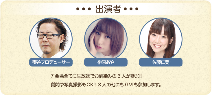 公式生放送でお馴染みの麥谷P、あやたん、ひとみんの3人が全国7ヶ所の拠点を巡るオフラインイベントを現在展開中。プレイヤーの皆さんと食事をしながら語らったり、ミニゲームなどで一緒に遊び、プレイヤー同士の交流を深めます。ミニゲームで決定した各拠点の特産品(食材)を使い、最後の東京会場で麥谷プロデューサーと榊原あやさんがリアル料理対決を行います。