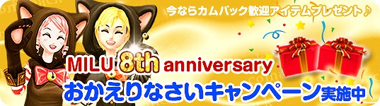 2016年7月7日(木)で、日本版「MILU」はお陰様で記念すべき8周年を迎えます。そこで、「JPN MILU」8周年記念キャンペーンを開催させていただきます。「ミルぽん_アニバーサル」を回したり、マジカル調合を行うことで、過去に登場したレアなアイテムが手に入るチャンスがあります。「MILU」の8周年をお祝いしていただけましたら幸いです。