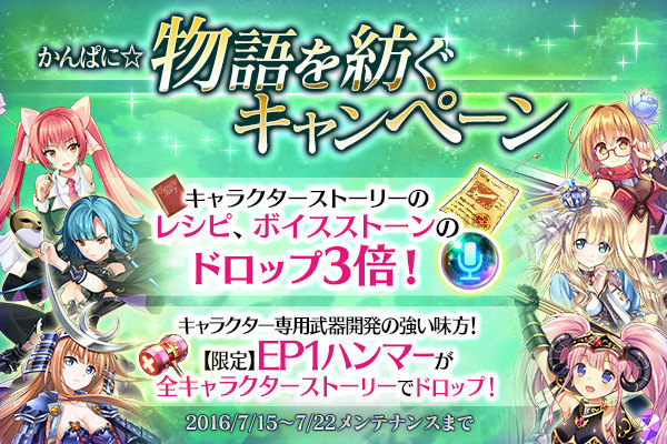 7月15日メンテナンス後~7月22日メンテナンスまで、「かんぱに☆物語を紡ぐキャンペーン」を開催いたします。キャラクターストーリーで出現するレシピのドロップ率、ボイスストーンのドロップ率が3倍にアップします!さらに、キャラクターストーリーEpisode1で入手できるレシピを使った専用武器開発時に効果の高い【限定】EP1ハンマーも登場します。