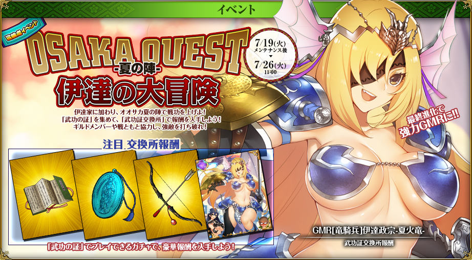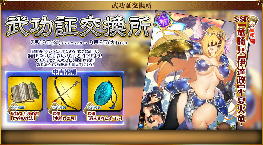 イベントポイント1000ptごとにイベントアイテム「武功の証」が手に入ります。「武功の証」1枚につき、「武功証交換所」の「武功ガチャ」を1回プレイできます。「武功ガチャ」からは、最高レアリティ「GMR」に進化可能な「[竜騎兵]伊達政宗-夏火竜-」をはじめとする、様々な報酬が手に入ります。