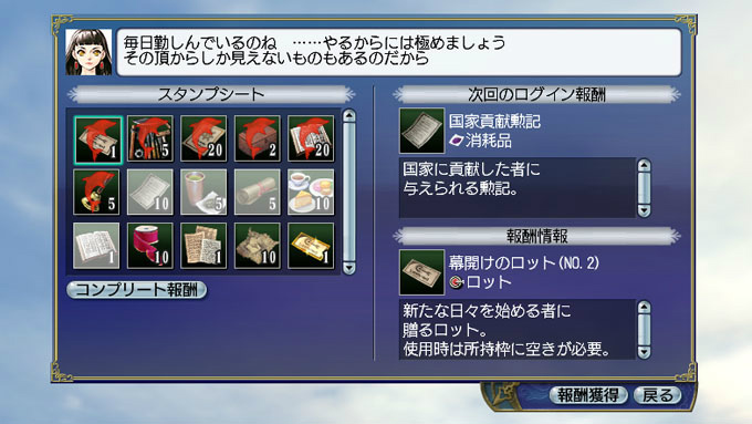ログイン時、画面右上に表示される「通知ボタン」を押すと、スタンプシートにログイン情報が記録され、「報酬獲得」ボタンを押すと報酬がもらえます。ログインはアカウントごとに判定され、15日分たまるとスタンプシートがコンプリートとなります。15日分の報酬をすべて受け取った状態で翌日にログインすると、新しいスタンプシートに更新されます。