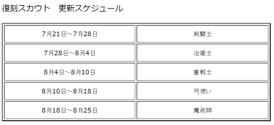 復刻スカウトはそれぞれのクラスに合わせる形で更新してまいります。また、既に登場済みのキャラクターであることから、プレミアムスカウト登場時よりも1体当たりの★5出現確率を0.7%から2.5%へ大幅にUPしております。お目当てのキャラクターを獲得するチャンスをお見逃しなく。