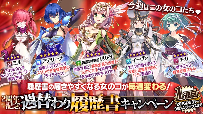 期間中は、週替わりで人気の社員5人からの履歴書が届きやすくなります!今週のアップデートで履歴書が届きやすくなる社員は、アーチャー系★4のEX社員「精霊の熾徒リリアナ」、ソルジャー系★5「アデリーナ」、クレリック系★5「イーヴァ」、ローニン系★4「チカ」、ローグ系★4「ミル」の5人です。毎日ログイン時に届く履歴書に上記社員からの履歴書が入っていることもあります。