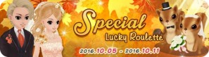 ご購入額に応じて挑戦回数が増える、とってもお得なラッキールーレットがスタートします。ラッキールーレットでは、花嫁、花婿姿になれる「☆オータムウェディングドレス(タキシード)」や、かわいいリスペットと仲良くなれる「お友達の素_ラブリス専用」などが獲得可能です。