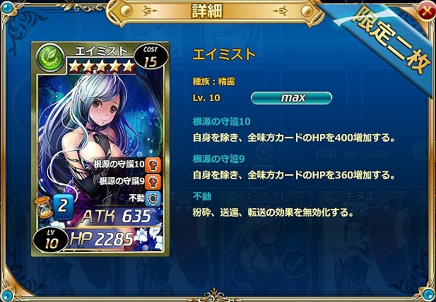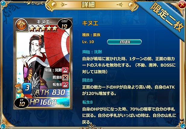 自身が戦場に置かれた時、1ターンの間、正面の敵カードのスキルを無効化する。(不動、魔神、BOSSに対しては無効)