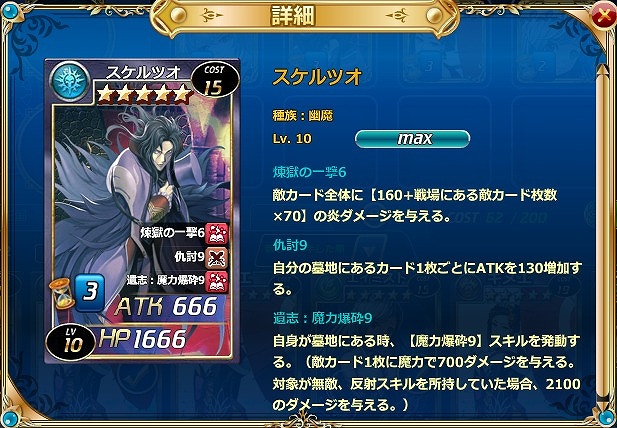 自身が墓地にある時、【魔力爆砕9】スキルを発動する。(敵カード1枚に魔力で700ダメージを与える。対象が無敵、反射スキルを所持していた場合、2100のダメージを与える。)