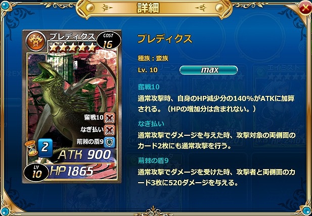 通常攻撃でダメージを受けた時、攻撃者と両側面のカード3枚に520ダメージを与える。