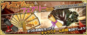 2016年11月2日(水)より、ゲーム内【ショップ】にて期間限定で【プレミアムセット】【フェアリーセット】【冒険者応援セット】【生産者応援セット】を追加致しました。