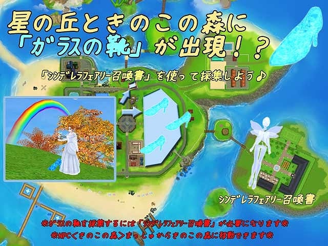 「シンデレラフェアリー召喚書」を使って、星の丘やきのこの森にあるガラスの靴を採集してみましょう。