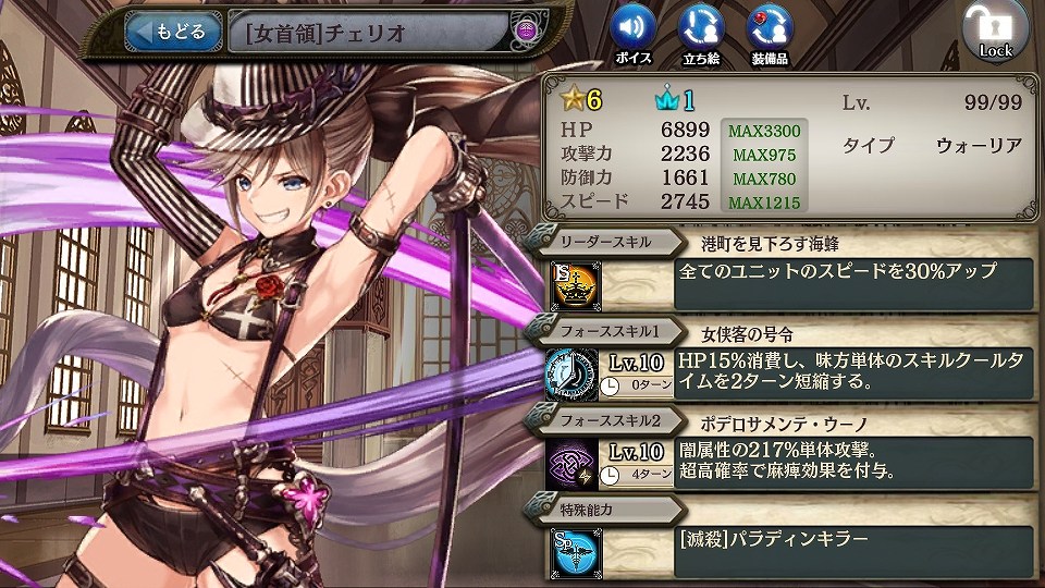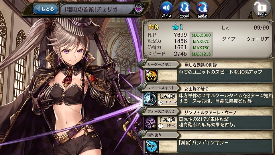 敵に「単体攻撃」+「超高確率で麻痺付与」するスキルを所持!進化前・後で、自身の「HPを消費」する代わりに、味方単体のクールタイム数を最大で2ターンまで減少させる「クールタイム短縮」スキルを所持!幻獣契約で、自身に「麻痺を付与」する代わりに,味方単体のクールタイム数を最大で3ターンまで減少させる「クールタイム短縮」スキルを所持!特殊能力に、「パラディンキラー」を所持!