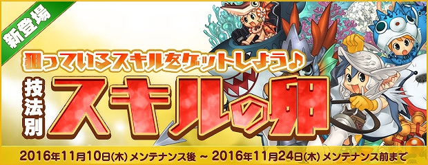2016年11月10日(木)定期メンテナンスにて、エンジェルモールに技法別「スキルの卵」を期間限定で追加いたしました。今回は技法別に分かれた「スキルの卵」となっておりますので、通常の「スキルの卵」と違い、ほしい種類の技法スキルが通常より狙いやすくなっています。以前から気になっていたスキルなどがあった方はぜひ、この機会にエンジェルモールをチェックしてくだください。