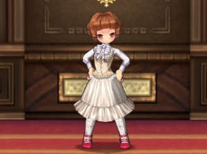 プリンセスのような華やかさを持ち、着こなしやすいベスト型のコルセット「EXシルクジャカード・ベスト(金)」、道化師(ハーレークイン)をイメージした「EXハーレクイン・フリルスカート(白)」。