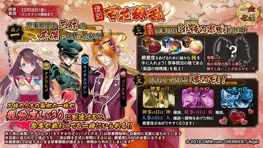 祭事期間中にログインすると、瓦版に「ククリヒメ」「キイチホウゲン」「ゴトクネコ」が自動的に送信されます。「ククリヒメ」「キイチホウゲン」「ゴトクネコ」は祭事期間が過ぎると、仲間から外れてしまいますが、花廊で入手できる贈物を渡して、親愛度Lvを「30」にする事で、正式に仲間となり、祭事期間が過ぎても一緒にいられます。瓦版に送られた三体のうち、二体以降を正式に仲間にするには親愛度Lvを「50」にする必要があります。