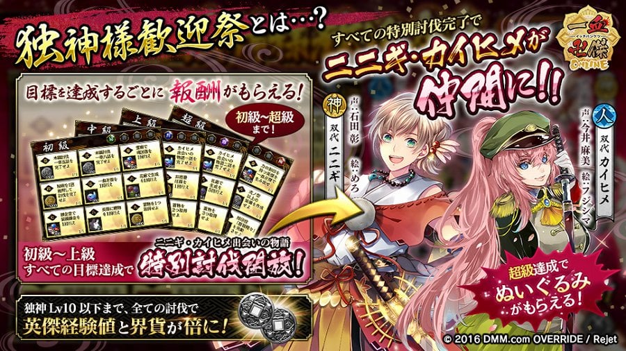 期間中、独神Lv10以下である間、「本編・曜日・祭事」の”すべての討伐”で「獲得英傑経験値」と「獲得界貨」が、2倍になります!