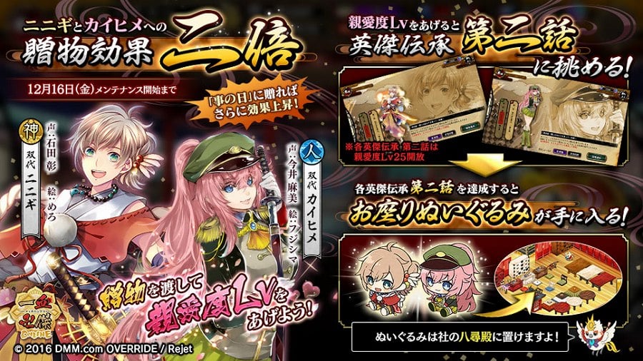 祭事「復刻 百貨繚乱」開催に伴い、ニニギとカイヒメへの贈物効果が二倍になります。事の日と併用すると、さらに大きな贈物効果を得る事ができます。親愛度Lvが上がると、英傑伝承の開放や、目録で再生できるボイスが開放されます!
