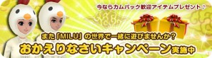 「MILU」の最終WEBログインが、1ヵ月以上経過したメンバー様が、キャンペーン期間中に「MILU」にログインすると、「おかえりプレゼント」として素敵なアイテムがプレゼントされます