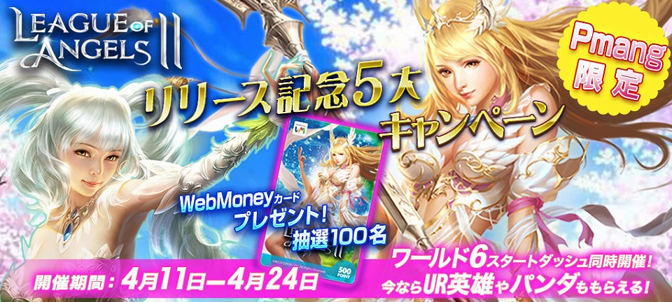 本日より開始される「【Pmang限定】リリース記念5大キャンペーン」は、レベル条件を達成すると「League of AngelsII」オリジナルデザインのWebMoneyカードが抽選で当たるほか、豪華ゲーム内アイテムやチケットがもらえるというものです。「Pmang」だけの限定キャンペーンとなりますので、ぜひ奮ってご参加ください。