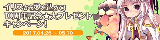 本日4月26日(水)定期メンテナンス終了後から5月10日(水)定期メンテナンス開始前まで、「イリスから愛を込めて!10周年記念★大プレゼントキャンペーン」を開催いたします。