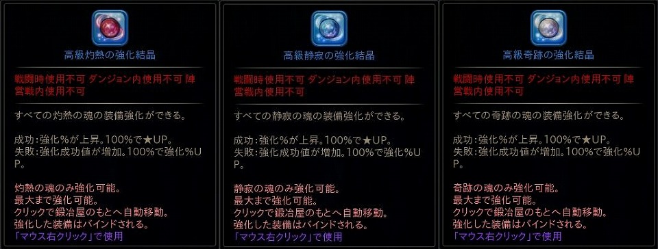 対象期間中、アイテムモールにて、灼熱・静寂・奇跡のいずれかの「高級魂の強化結晶」を条件個数分ご購入いただいた方に「強化結晶」や「混沌の強化結晶」をプレゼントします。さらに、次回の定期メンテナンスまで魂の強化成功率が2倍となっています。ぜひ、この機会に魂を強化してさらなる高みを目指しましょう!