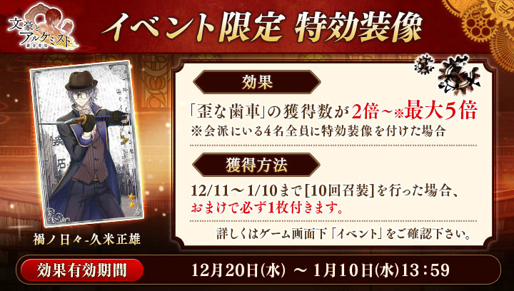 また期間中、召装にて10連召装を行うと、イベント限定特効装像「禍ノ日々-久米正雄」がおまけで必ず1枚付きます。この装像には、「歪な歯車」の獲得数が2倍~最大5倍になる特別効果があります。