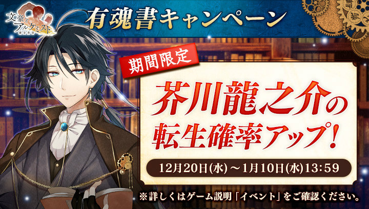 期間限定で文豪「芥川龍之介」の転生確率が上昇する、有魂書キャンペーンを開催いたしました。期間中はすべての洋墨投入量で転生いたします。