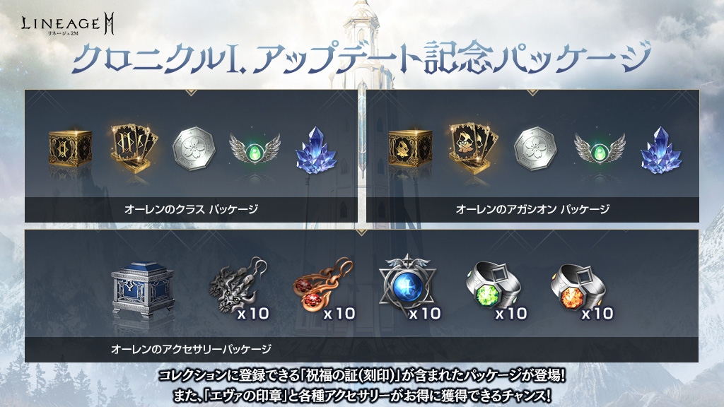 「賢者の翼箱(刻印)」に加え、「祝福の証(刻印)」や「オーレンの上級クラス(アガシオン)獲得券(11回)(刻印)」「光る高級クリスタル幸運箱(刻印)」などが獲得できる、お得な「オーレンのクラスパッケージ(刻印)」「オーレンのアガシオンパッケージ(刻印)」が登場しました。