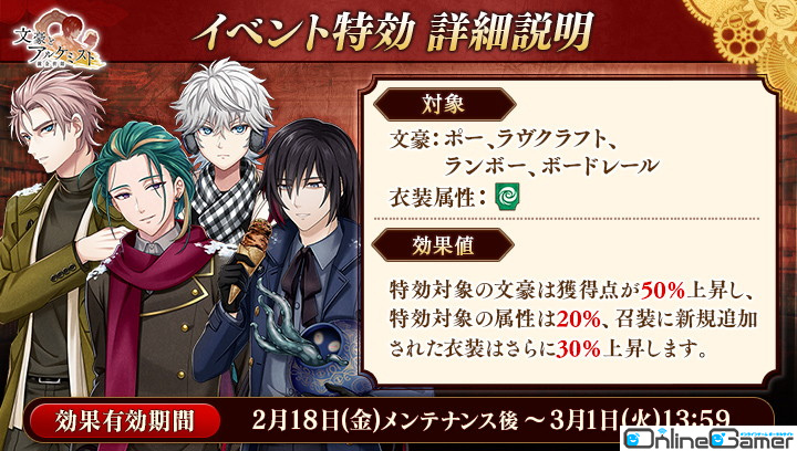 期間中「ポー」「ラヴクラフト」「ランボー」「ボードレール」の衣装を編成して潜書すると、得点の獲得数がそれぞれ50%上昇します。また、「風」属性の衣装を編成して潜書すると、得点の獲得数がそれぞれ20%上昇します。