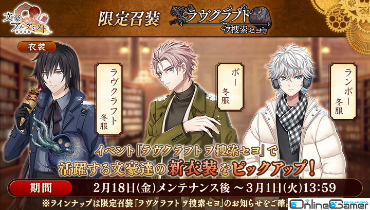 文豪の「衣装」や、会派に装備する事で能力を強化できる「装像」などが入手できるコンテンツ「召装」に、限定召装「ラヴクラフト ヲ捜索セヨ」が期間限定で登場します。この召装では、イベント「調査任務『ラヴクラフト ヲ捜索セヨ』」で活躍する「ラヴクラフト」「ポー」「ランボー」の新衣装を一定の確率で入手できます。
