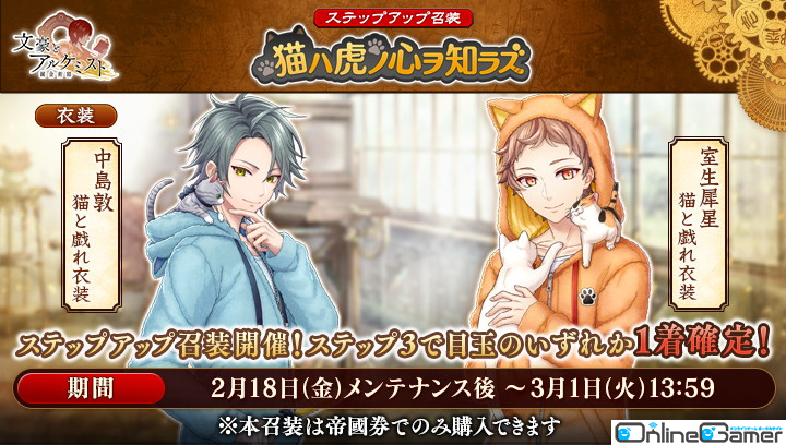 文豪の「衣装」や、会派に装備する事で能力を強化できる「装像」などが入手できるコンテンツ「召装」に、限定召装「猫ハ虎ノ心ヲ知ラズ」が期間限定で登場します。この召装では新しく追加された中島敦と室生犀星の〈猫と戯れ衣装〉を獲得できます。