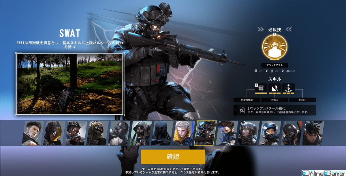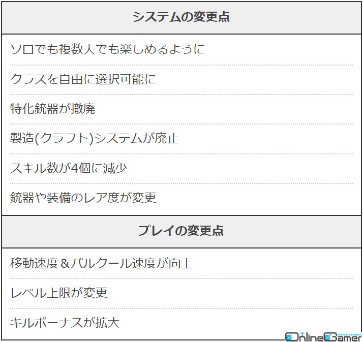 クラスのランダム選択がなくなり、毎試合自分でクラスを選択することが可能に。合わせて特化銃器システムも撤廃されたため、クラスに関係なく好きな武器を使えるようになった点も嬉しいです。ただし、スキルの関係上特定の武器を所持した方がいいクラスは存在するので、その点には注意しましょう。