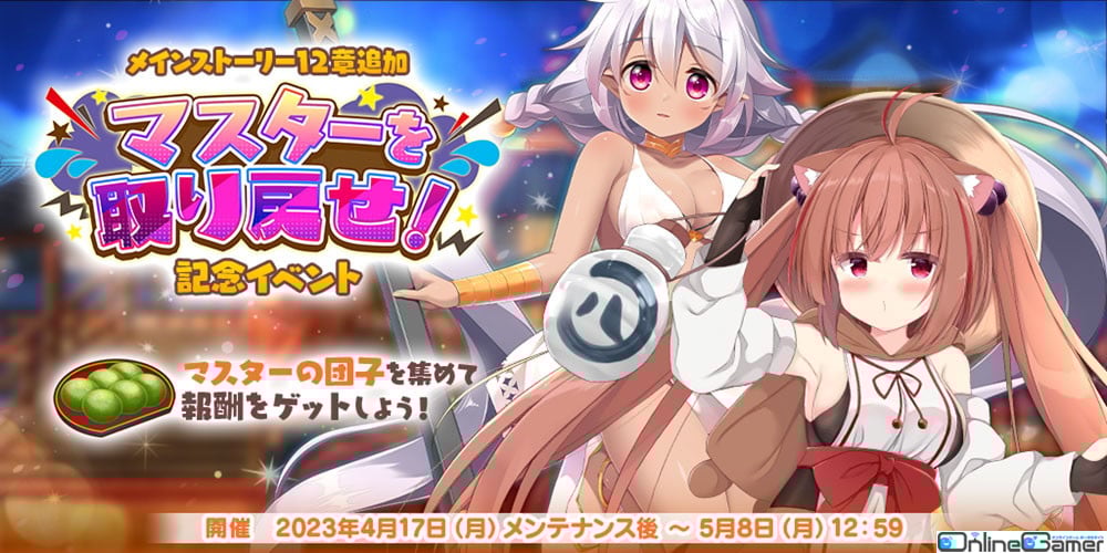 新たにメインストーリー12章が先行でお楽しみいただける、記念イベントを開催いたします。記念イベントはメインクエストのクリア状況に関係なく、どなたでも参加することが可能です。イベントアイテム「マスターの団子」を集めることで様々な報酬と交換も可能ですので、ぜひ、この機会にご参加ください。
