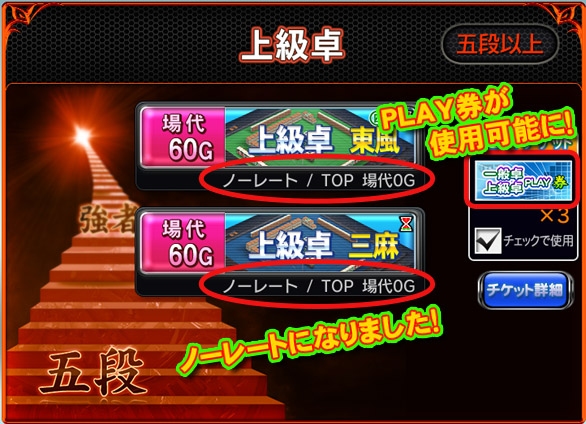 「一般卓PLAY券」が「一般卓/上級卓PLAY券」に変更となりました。アップデート前に所持していた「一般卓PLAY券」もアップデート後は「一般卓/上級卓PLAY券」となります。また、ログインボーナスも「一般卓/上級卓PLAY券」に変更となるためMJチップやGOLDが無いプレイヤーも上級卓でプレイする選択肢が増えます。