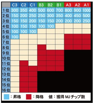 一般卓/上級卓を1試合以上プレイすることで公式リーグに自動エントリーとなり、同じ階級のプレイヤー同士で「グループ」が結成されます。「グループ内の順位」によって階級が昇降格し、昇格したプレイヤーは「階級」と「グループ内の順位」に応じた「MJチップ」が報酬として付与されます。